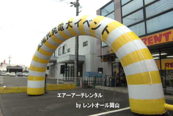 ●エアーアーチのレンタルはレントオール岡山へ ●サイズ:外寸W7000×H4500×?1000 内寸W5000×H3500 ●電 源:AC100V200W ●レンタル料金→¥50,000/1泊2日まで(税別) ●文字(カッティングシート)別途見積り ●商品センター取寄せ商品につき別途・取寄・返却運賃が必要です。