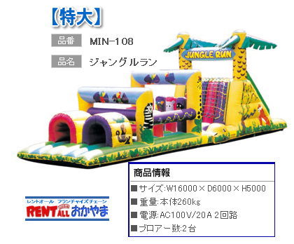 ●ジヤングル ランのレンタル ●商品センター取寄せ商品につき別途・取寄・返却運賃が必要です。 ●サイズ:W16000×D6000×H5000 ●定 員:20名 ●送風機:AC100V X2台 ●レンタル料金¥200,000/1日(税別)