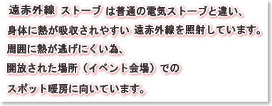 ●遠赤外線電気ヒーター(1kw)レンタル (電気ストーブ) ●サイズ:W360×D320×H850 ●重 量:4.9kg ●レンタル料金→¥4,500/2泊3日まで(税別) ●灯油がダメな展示会場もこれでOK! ●1シーズン(約3ヶ月間)の場合は→¥16,000/1シーズン(税別)