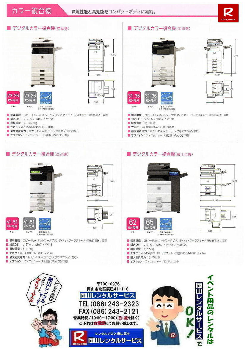 | ●デジタルカラー複合機(カラーコピー機)のレンタルは岡山レンタルサービスへ ●本体サイズ:幅815×奥695×高さ950 ●消費電力:最大1.45kw以下 ●複写速度:白黒 毎分26枚 ●複写速度:カラー 毎分26枚 ●電源:AC100V 15A ●レンタル料金→別途見積り ●カウント料金→¥7/枚(税別)/モノクロ ●カウント料金→¥28/枚(税別)/カラー ●搬入・搬出費は別途となります。 |