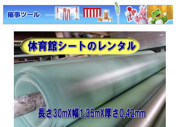 体育館シートレンタル・フロアーシートのレンタルは レントオール岡山へご相談下さい●サイズ:W30mX1.35mX厚さ0,42mm●レンタル料金→¥10,000/(30m)(税別) ●商品センター取寄せ商品につき別途・取寄費用(往復)・が必要です。
