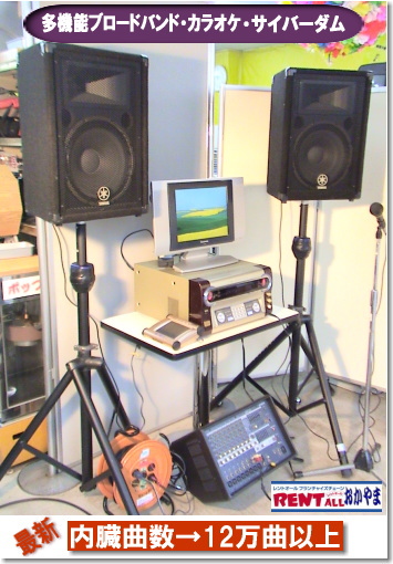 ●最新のヒット曲:8万曲内臓はこれだけ。 ●メーカー最新ダウンロードはサイバーDAMのみ、となります。 ●80,000曲以上内臓のすぐれ物。 ●レンタル通信カラオケはレントオール岡山へご相談下さい。 ●レンタル料金→¥40,000/1泊2日(税別) ●運搬費用(岡山市内)→¥1,500X往復〓¥3,000(税別) ※12万曲以上内臓のブロードバンドサイバーDAMはこちら