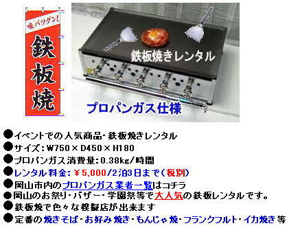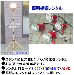 ●お花見用品(その他)・バザーレンタルはレントオール岡山 ●パイプテントレンタル・テーブルレンタル・椅子レンタル・アルミベンチレンタル ●鉄板焼機レンタル・タコ焼機レンタル・綿菓子機レンタル お花見カラオケレンタル ●大鍋レンタル・寸胴鍋レンタル・大型3連ガスコンロレンタル ●ポップコーン機レンタル・フライヤーレンタル(18リットル) 紅白幕レンタル ●スタンド式クーラーBOXレンタル・タイ焼き機レンタル・座卓テーブル ●その他・模擬店レンタル商品はこちら
