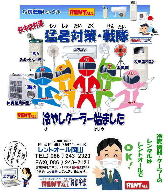 ●暑さ対策・熱中症対策でのエアコンレンタルはレントオール岡山へ ●岡山での冷房機器のレンタルはレントオール岡山へご相談下さい。 ●上記商品はレンタル料金の他・設営・解体・運搬費用が必要です。 ●お見積りが必要な場合は、設置場所(1F・2F・3F?)電源容量(単相・三相?) ●坪数(広さ?)室外機の設置場所・等々詳しい現場下見が必要です。 ●シーズン等は混み合いますので、ご了承下さい。 ●上記物品は商品センターより取寄せ商品となります。 ●クーラーのレンタル・エアコンのレンタルはレントオール岡山へ |