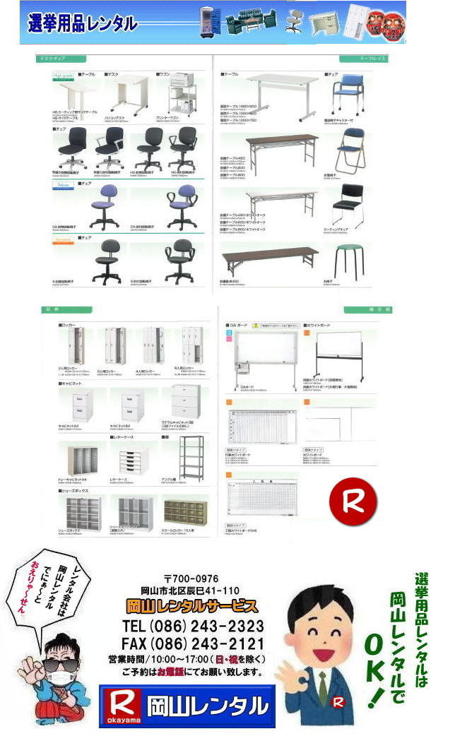 |選挙用備品| レンタル| 岡山の選挙| レンタル料金| 選挙用品 レンタル 机 椅子| 空調| 通信 | 備品レンタル 什器 片袖机| 回転椅子|