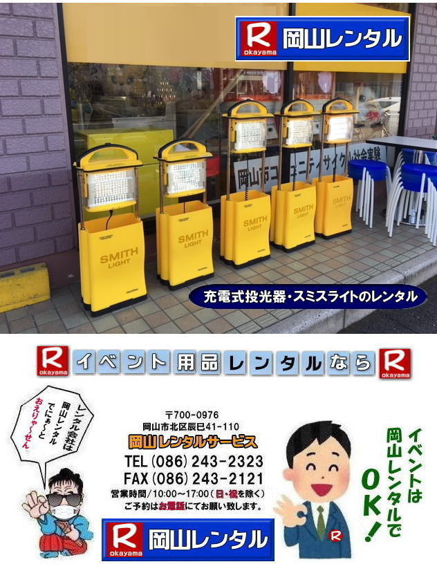 ●充電式スミスライトのレンタル(ポータブル投光機のレンタル) ●レンタル料金→¥10,,000/1日(税別) ●持ち運びラクラク ●充電式なので発電機不要 ●電源のない所でご使用出来ます。 ●雨天でもご利用出来ます。 ●お花見用投光機のレンタル(コード要らず) ●商品センター取寄せ商品につき別途・取寄・返却運賃が必要です。