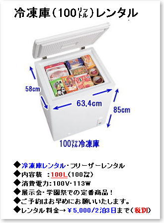 ●大型冷凍庫レンタル(フリーザー)は岡山レンタルサービスへ ●学園祭・展示会・などでご利用頂いております。 ●サイズ→W1,825XD721XH1,009 ●レンタル料金→¥60,000/2泊3日まで(税別) ●商品センター取寄せ商品につき別途・取寄・返却運賃が必要です。
