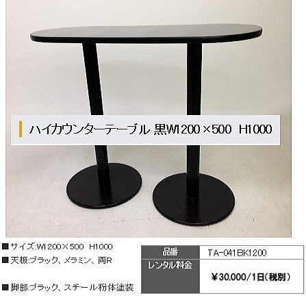 ●ハイカウンターテーブルのレンタル料金 ●サイズ: W1200×D500×H1000 ●天板:ブラック、メラミン ●脚部:ブラック、スチール焼付塗装 ●レンタル料金→¥30,000/1日(税別) ●センター取寄せ商品につき別途・取寄・返却運賃が必要です。 ●概略取寄せ費用、1テナーで片道¥20,000X2が目安です。