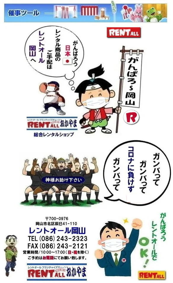 〒700-0976 岡山県岡山市辰巳41−110 レントオール岡山 TEL( 086 ) 243-2323 FAX( 086 ) 243-2121 営業時間/10:00〜18:00(日・祝を除く)