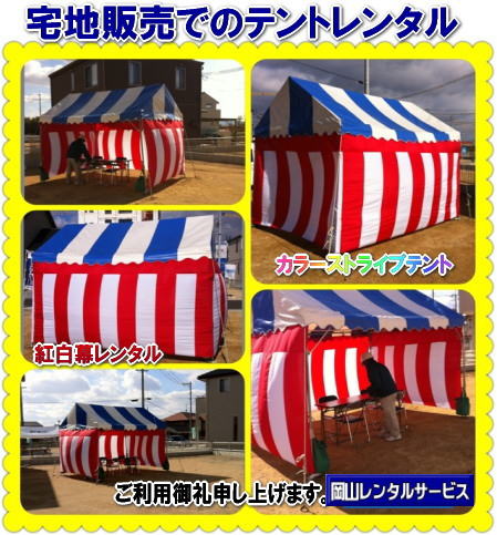 ●1.5K×2K カラー: ストライプ:青/白・ 赤/白・ 黄/白・ 緑/白 ●1.5K×2Kレンタル料金→¥8,800/2泊3日まで(税込み ●2K×3K カラー: ストライプ:青/白・ 赤/白・ 黄/白・ 緑/白 ●2K×3Kレンタル料金→¥11,000/2泊3日まで(税込み) 岡山 レンタルテントのことなら岡山レンタルサービスで決まり! イベントレンタル・テントはカラーテントが可愛いですね〜。