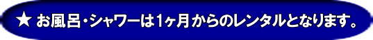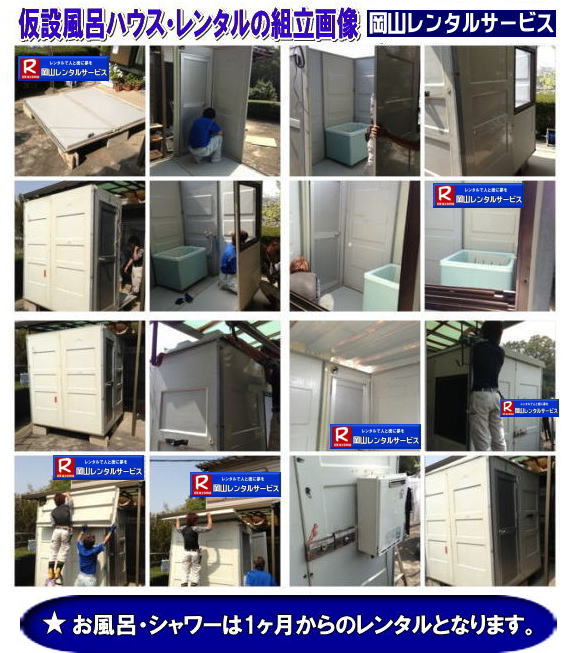 | ●お風呂も入りたい方&シャワーで簡単に済ませたい方もOK ●お風呂&シャワーレンタル ●搬入・搬出も岡山レンタルサービスが手配致します。 ●レンタル料金→¥75,000/1ヶ月レンタル(税別)1棟 ●搬入・搬出費用→¥25,000/片道X2(岡山市内)(税別) ●配管・排水等は現地の水道屋さんでご手配下さい。 ●別途プロパンガスの手配も必要です。 ●配在庫が少ないため、お問合せ・ご予約は早めにお願いいたします |